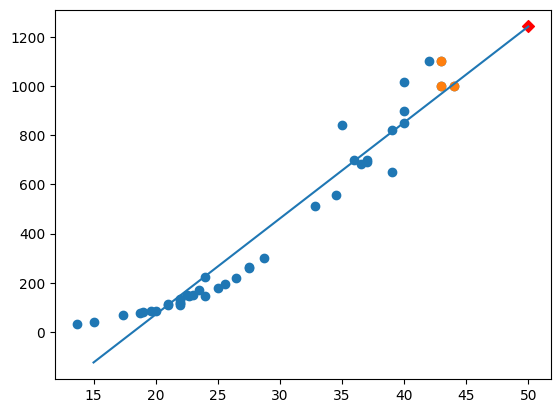 plt.scatter(50, 1242, marker='D', c = 'r')
