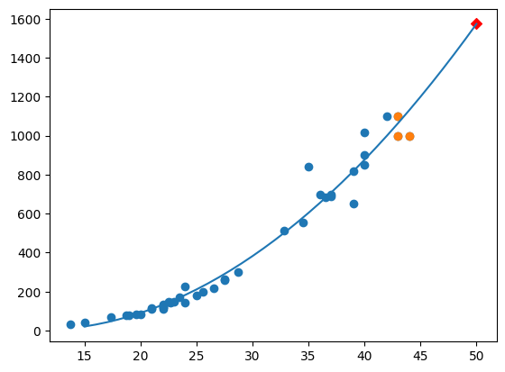 plt.scatter(50, lr.predict([[50**2, 50]]), marker='D', c = 'r')