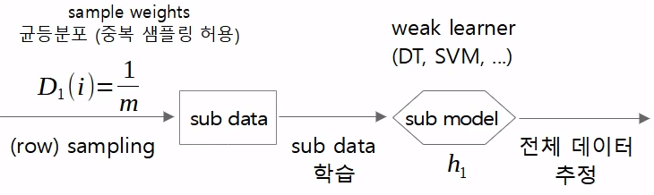 앙승블 학습을 읽고 와주세요 해당 내용에 나오는 사진과 내용은 meanxai - 에이다부스트[1/4] (Adaptive Boosting: AdaBoost) - 기본 알고리즘 에서 사용했습니다. 부스팅은 개별 트리의 실수(오차)를 통해 학습합니다. 이전 트리의 오차를 기반으로 새로운 트리를 훈련하는 것이 기본적인 아이디어입니다. (각각의 트리가 독립된 연산을 수행하는 '배깅'과 다르다는 것을 알 수 있습니다) 그 예로 에이다부스트가 있습니다. 에이다부스트는 전형적인 부스팅 학습의 일종으로써 오류 샘플의 가중치를 높여 잘못된 예측에 더 많은 주의를 기울입니다. 에이다부스트의 학습 과정 - 균등분포로 학습 데이터를 샘플링해서 weak learner (약한 모델)로 학습 후, error (추정오차)를 측정합니다..